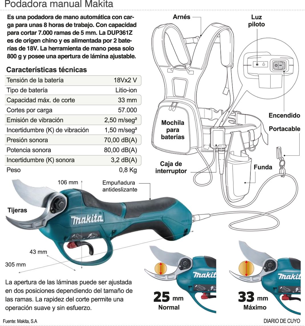 La tijera de poda automática permite hacer unos 20.000 cortes por día y con la carga de sus baterías puede trabajar 8 horas diarias, con una potencia de corte enorme (ver infografía). Además viene con un serrucho para poder hacer cortes de los troncos más gruesos. Es un producto importado y hoy tiene un costo de 70 mil pesos.
