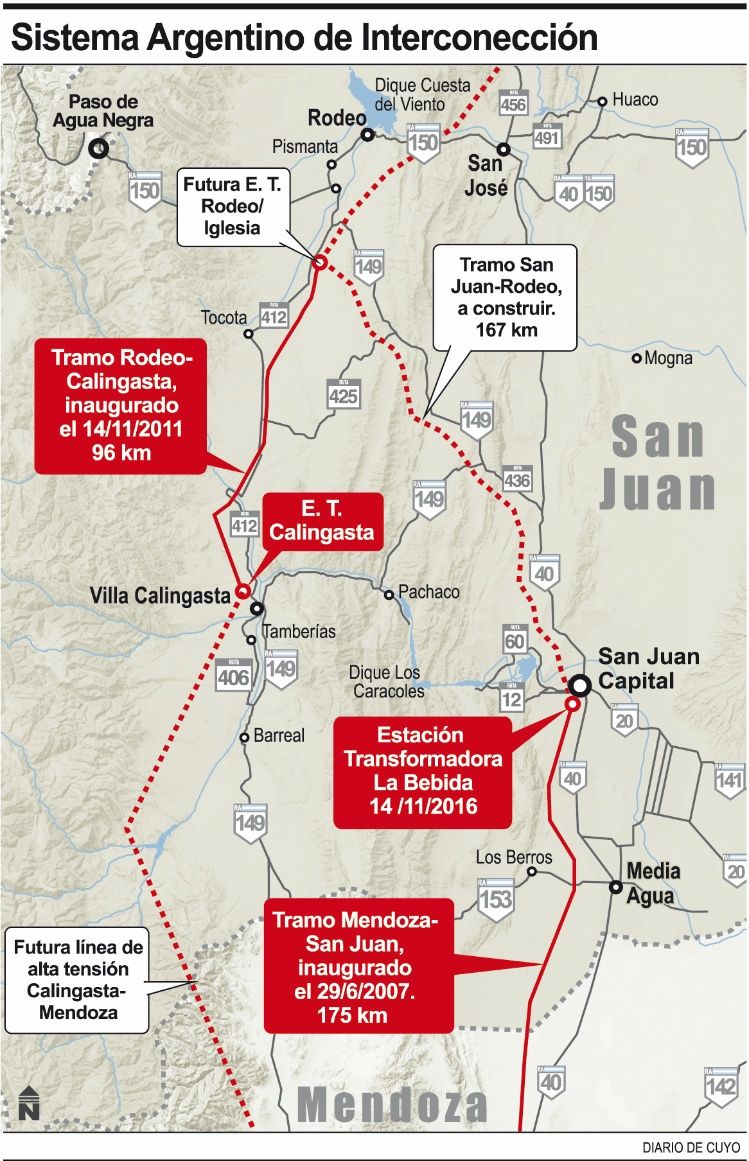 La obra no sólo alejará la posibilidad de cortes en el servicio, sino que también asegurará la provisión eléctrica a Calingasta, Jáchal y Valle Fértil y a los emprendimientos mineros ubicados en la zona, es decir las minas Casposo y Gualcamayo. En el futuro también permitirá transportar la potencia que genere el futuro dique Tambolar.