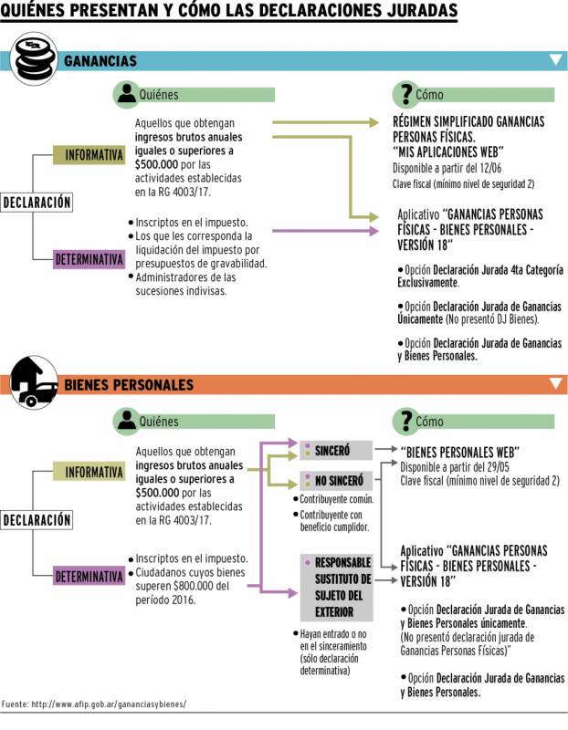 Aquellos trabajadores en relación de dependencia que durante 2016 hayan ganado $ 41.666 brutos o más por mes o hayan tenido ingresos anuales iguales o superiores a $ 500.000 y que sus propiedades, autos y demás tenencias estén valuados en más de $ 800.000, que es el mínimo no imponible del impuesto sobre Bienes Personales, deben presentar su Declaración Jurada determinativa entre el 12 y el 16 de junio ante la Administración Federal de Ingresos Públicos (AFIP). Siempre y cuando no hayan tenido el alta en el impuesto.