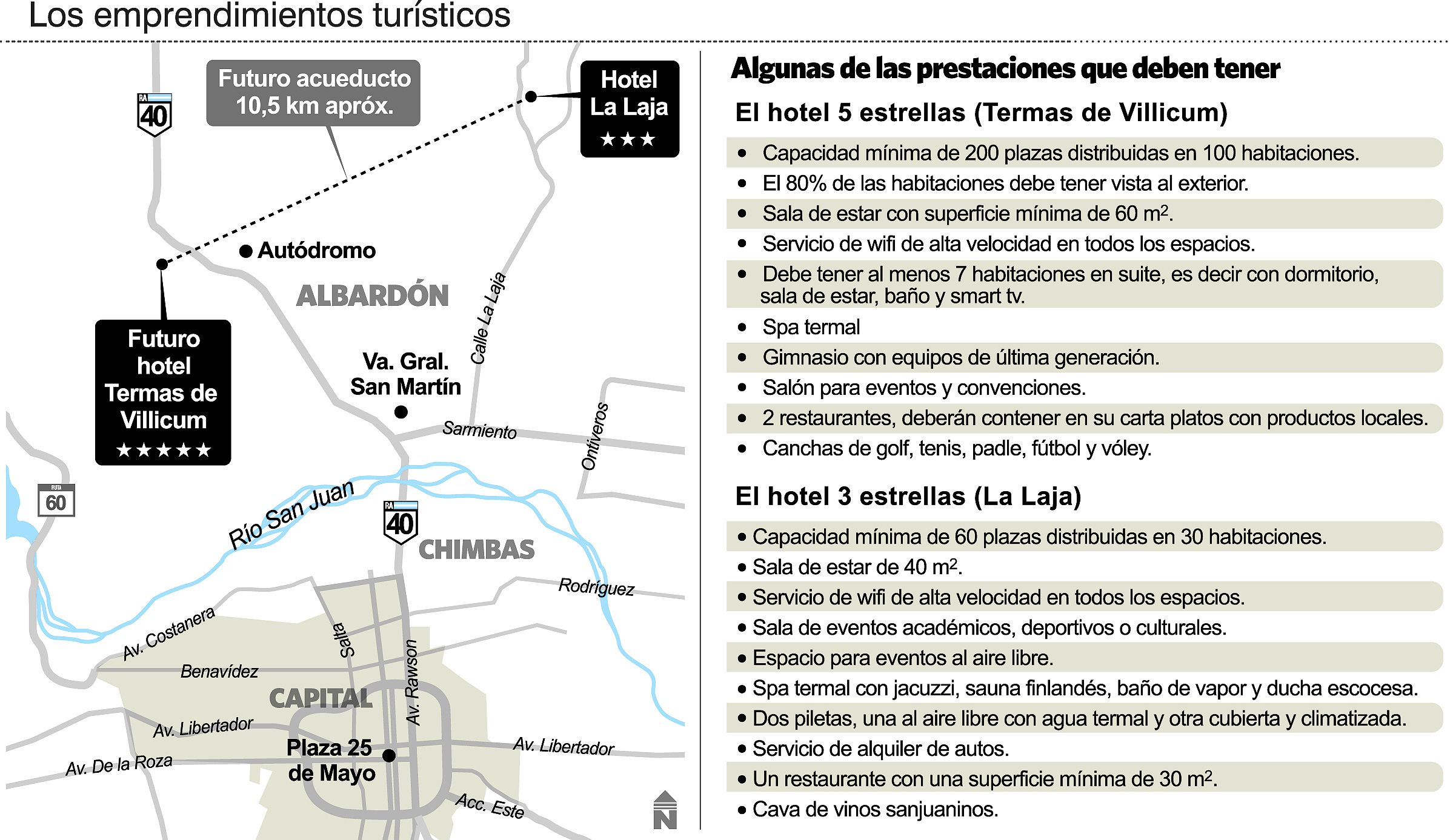 Al final, los dos hoteles que quieren construir en Albardón tendrán spa con aguas termales y el Gobierno sanjuanino se hará cargo del tendido del acueducto desde La Laja, a lo largo de unos 10,5 kilómetros, hasta la zona aledaña al nuevo autódromo, donde estará emplazado el 5 estrellas. El otro será un 3 estrellas, que estará donde ya funcionó un complejo termal, que ahora está cerrado. Ayer se conoció que la intención oficial es hacer el llamado a licitación a fines de noviembre, en una modalidad en la que los inversores deberán aportar el capital para las obras, según adelantó la ministra de Turismo, Claudia Grynszpan.