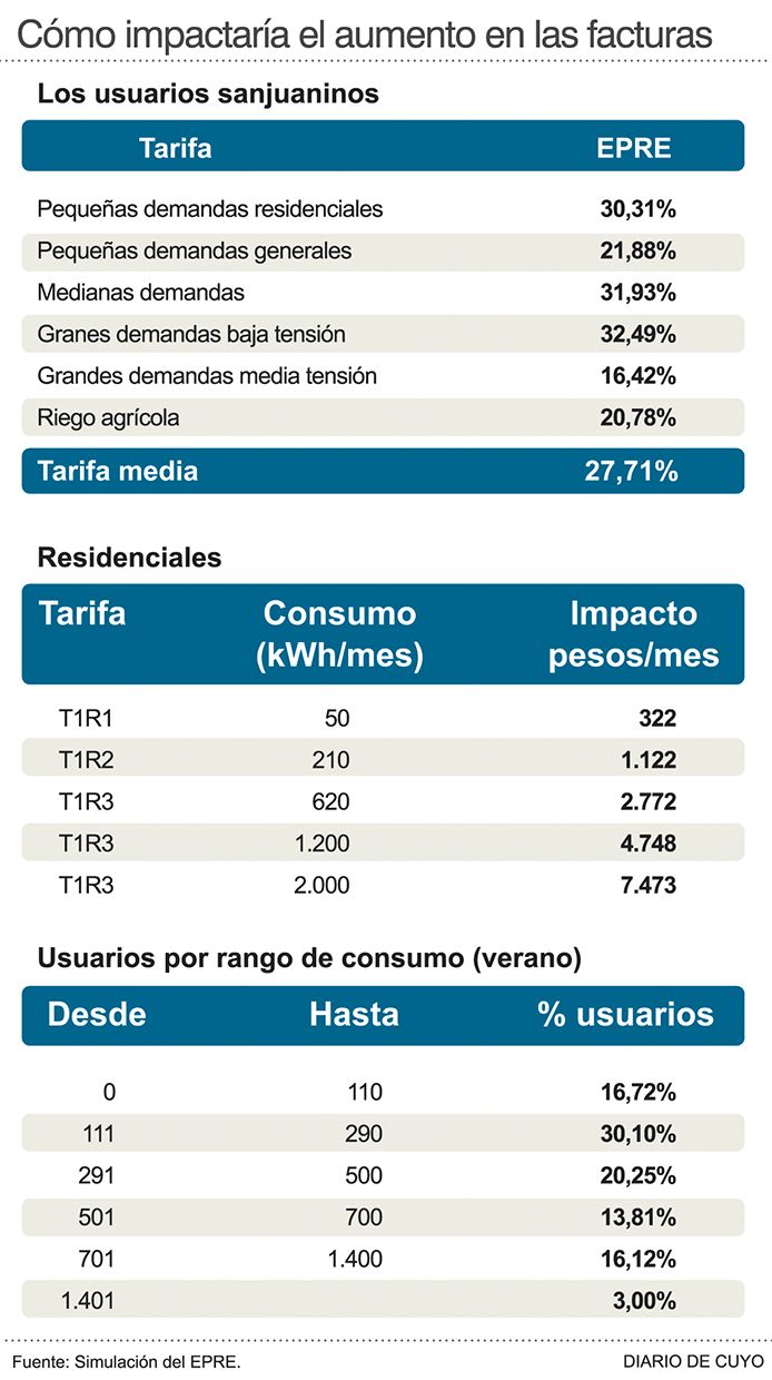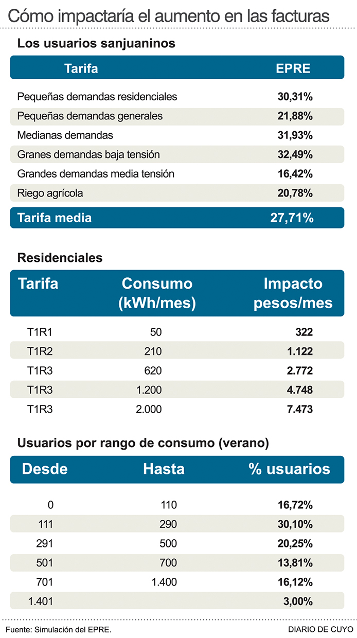 El sector empresario sanjuanino salió a criticar con dureza el fuerte aumento que se viene el mes próximo en la tarifa de la luz ya que aunque consideran que debe subir, no esperaban que fuese tanto; y cuestionan el impacto que tendrá. De acuerdo a la audiencia pública realizada el lunes pasado, el EPRE estima que la tarifa eléctrica en San Juan subirá alrededor de un 27% promedio (algunos sectores más, otros menos: Ver Infografía). Tendrá vigencia a partir del 23 de enero, se pagará en las facturas que llegan en abril, y es el aumento más alto que se recuerde.