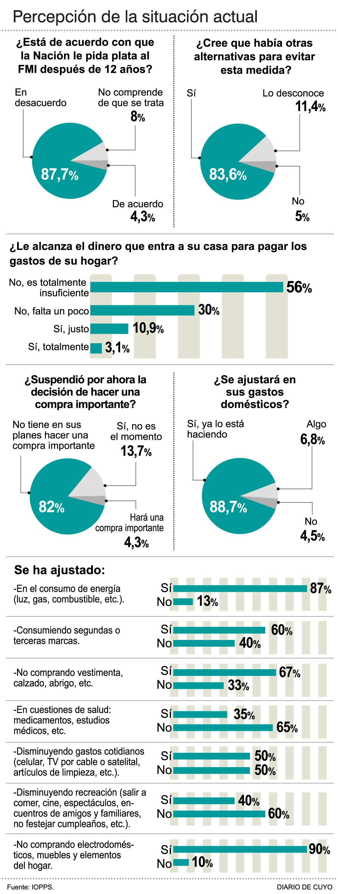 La mayoría -casi un 90%- fue contundente en confirmar el rechazo a la decisión de volver a tocar la puerta del Fondo Monetario Internacional. Al hombre común no le cayó nada bien que la Nación recurra a los préstamos del organismo recordado por haber exigido a cambio de prestar sus dólares los ajustes más dramáticos en los años "90, que terminaron siempre afectando el bolsillo de la gente. Se puede interpretar también que este resultado refleja que el sanjuanino descree de lo que expresó el ministro de Hacienda, Nicolás Dujovne, acerca de que el FMI ha cambiado. Es decir, supone de antemano que las condiciones que pondrá para prestar un monto que, según se sabe, estaría cerca de los 30 mil millones de dólares, determinarán a futuro un ajuste que presagia un escenario sombrío para la economía y para San Juan. De hecho, más del 70 por ciento de los encuestados se ubicó en el bando que considera que las perspectivas de la economía a futuro serán peor a partir de esta decisión política, y que también impactarán negativamente en la provincia en general y en su vida diaria (ver Más del …) Llama la atención cuánto se diferencia la percepción de la gente de la de los empresarios sanjuaninos. El pasado 9 de mayo, un día después del anuncio presidencial, la mayoría de referentes sectoriales y de cámaras manifestaron a DIARIO DE CUYO que no creen que habrá recesión tras el acuerdo. Salvo el sector del comercio -que ya viene sintiendo de hace rato la baja en el consumo- exportadores, mineros e industriales se mostraron optimistas con el futuro de la economía siempre que se recorte el gasto público, y aplaudieron que se recurra al financiamiento más barato existente en este momento en plaza. En cambio en la encuesta realizada desde ese mismo día, y hasta el viernes 11 de mayo por el Instituto de Opinión Pública y Proyectos Sociales (IOPPS) sobre 450 casos en el Gran San Juan no se obtuvo ningún resultado mayoritario positivo (ver infografías páginas 2 y 4) por parte de la población. Seguramente el pesimismo viene porque en los últimos meses están sufriendo el impacto en carne propia. La suba de precios de los alimentos y de las tarifas de servicios del primer cuatrimestre con un sueldo que no rinde ha provocado a una gran porción de población tener que remar cuesta arriba para llevar adelante la casa. El gasto privado, tanto en inversión como en consumo, se ha desacelerado bruscamente, sino basta recorrer los shopping, hipermercados y comercios minoristas, casi vacíos; y donde los empleados se la pasan chateando con el celular luego de limpiar dos veces lo mismo ante la ausencia de clientes. Por eso no llama la atención que en la encuesta la mayoría refleje que el dinero ya no le alcanza para llegar a fin de mes, incluso hace rato desterraron los planes de realizar alguna adquisición. Los electrodomésticos, muebles y artículos del hogar son los que resultaron más afectados en este freno de consumo, seguidos de la compra de ropa y calzado; y las salidas a comer, ir al cine o a ver algún espectáculo. El tarifazo de luz y gas obligó a achicar los consumos de energía, y la elección de segundas marcas y de productos que se venden "sueltos" hace rato que forman parte de la realidad cotidiana de muchos hogares en la provincia, a juzgar por la encuesta.