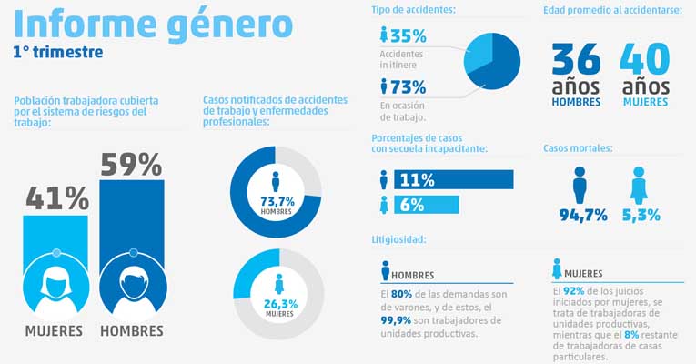 De los datos publicados en este primer informe, que abarca los primeros tres meses del 2017, se desprende que la población cubierta por el Sistema de Riesgos del Trabajo -trabajadores asalariados registrados-, está compuesta por un 41% de mujeres y un 59% de varones. Indica, a la vez, que la edad promedio al accidentarse o enfermarse en hombres es de 36 años y en las mujeres es de 40 años.