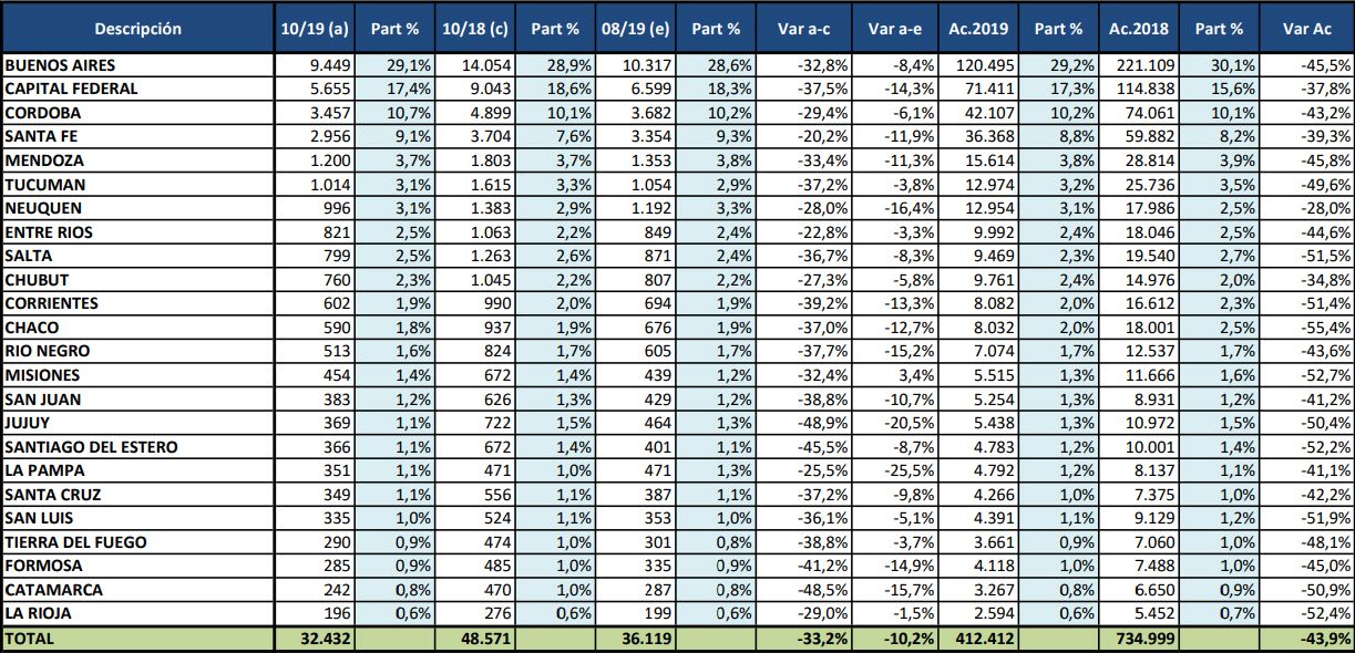 En cuanto al acumulado del año, la provincia lleva en 10 meses una baja con respecto a igual periodo del año pasado del 41,2%, un tanto mejor que la -43,9% que promedió el país.
