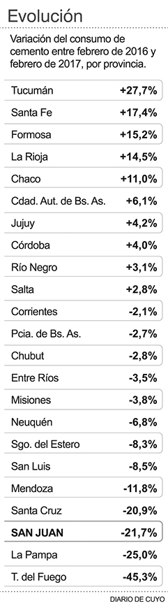 El comienzo del año no fue bueno para la construcción en San Juan, según uno de los principales indicadores que mide el ritmo de uno de los sectores más dinámicos de la economía. Mientras el consumo de cemento en Argentina disminuyó 0,4% en febrero respecto a igual mes del año pasado, en esta provincia cayó 21,7% en el mismo período, según publicó la Asociación de Fabricantes de Cemento Portland. Con esta contracción San Juan se ubica tercera en el ranking (ver infografia) de mayores bajas, después de Tierra del Fuego (-45,3%) y La Pampa (-25%).