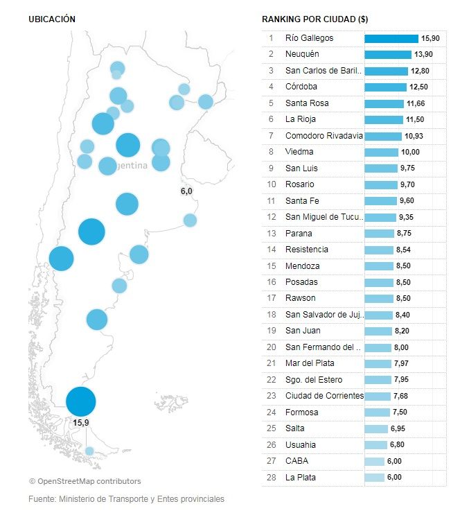Cabe destacar que el boleto normal sanjuanino cuesta $8,20, comparado a los $15,90 de Río Gallegos y a los $6 de Capital Federal y La Plata.