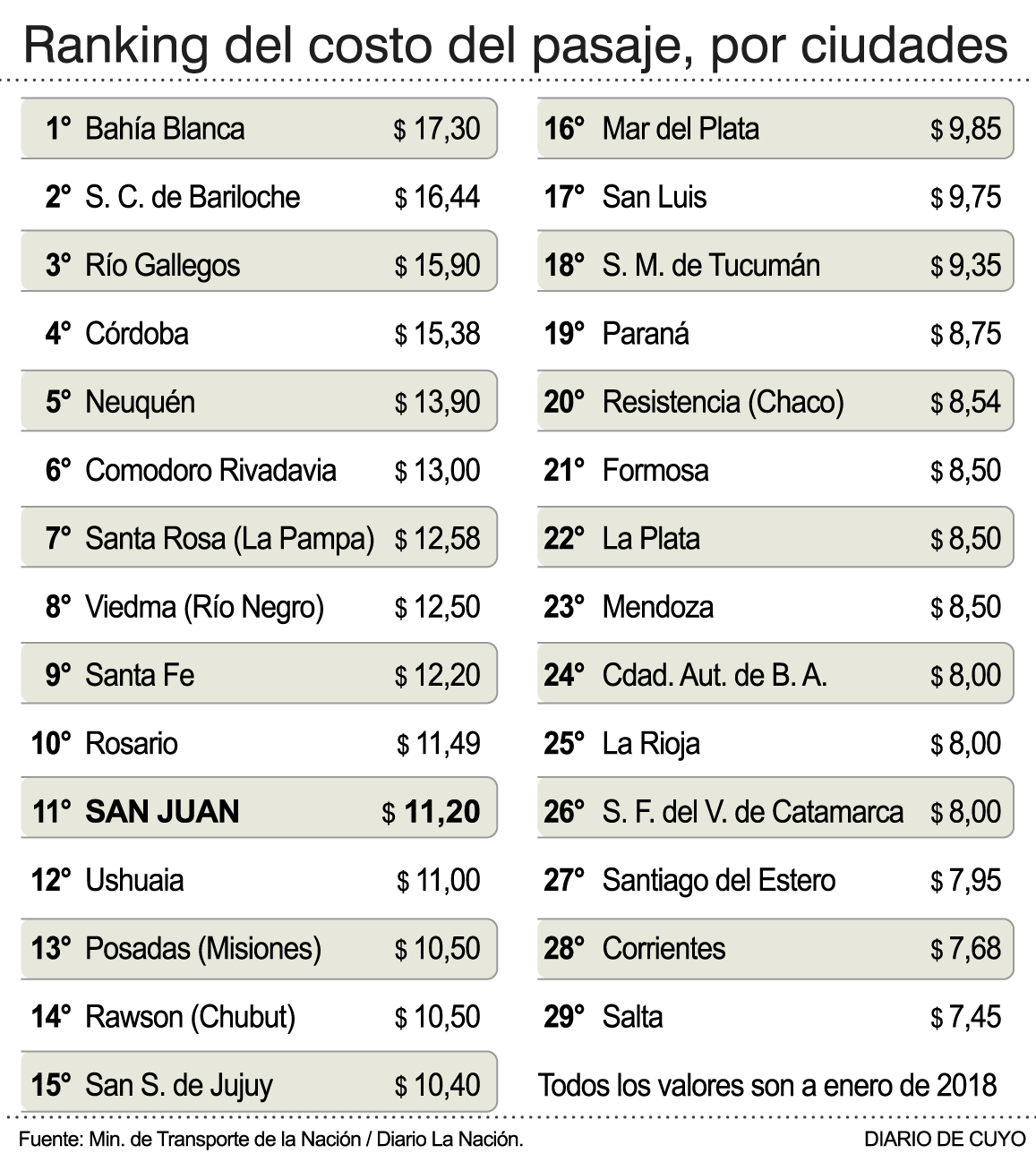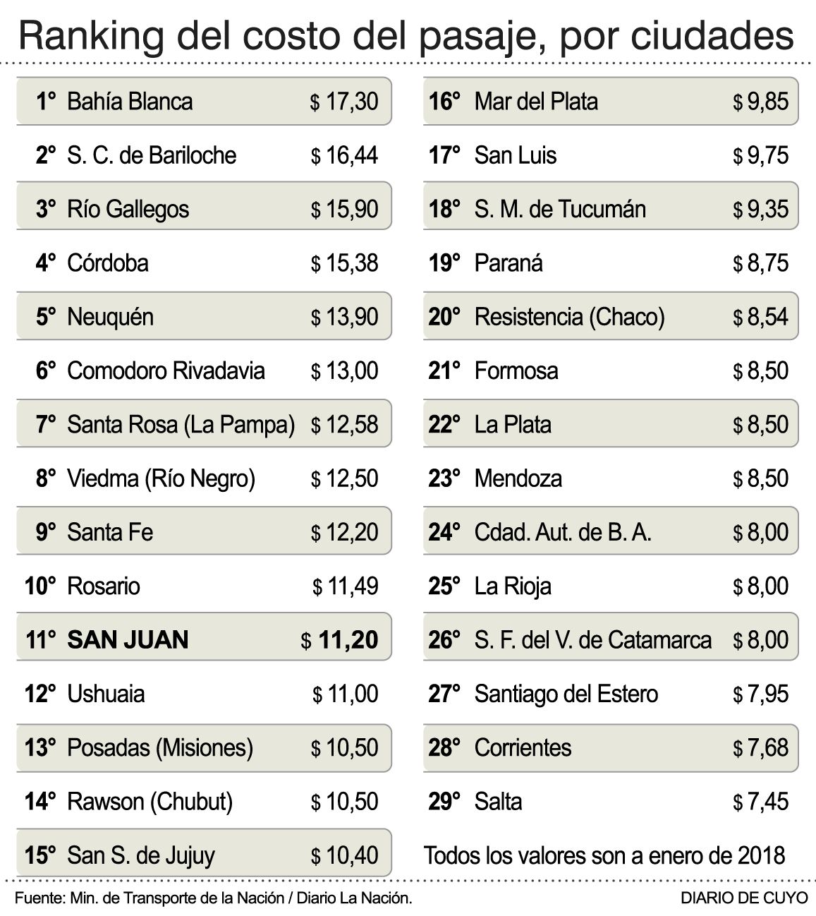 A partir del incremento de la primera sección de la SUBE, que desde el 1ro de enero último trepó a 11,20 pesos, San Juan pasó a ubicarse en el lote de las provincias con el valor del pasaje más caro del país. Es porque se ubica en el lugar número 11º, entre 29 ciudades argentinas, según datos del Ministerio de Transporte de la Nación y un relevamiento del diario La Nación. La cifra es superior incluso a la de otros estados del Nuevo Cuyo, como San Luis (9,75 pesos), Mendoza (8,50 pesos) y La Rioja (8 pesos).