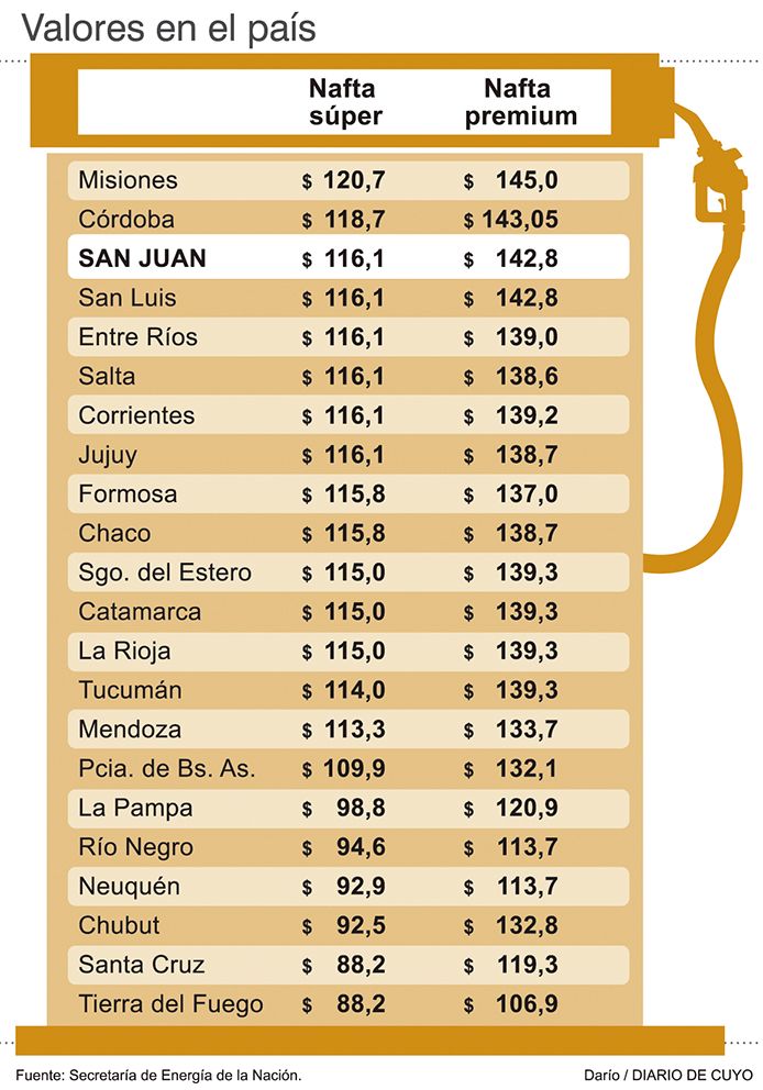 En marzo del 2019, San Juan estaba en el segundo puesto en un ranking nacional de las provincias con las naftas más caras del país y ahora, con la suba del lunes, pasó al tercer puesto, que comparte con San Luis, de acuerdo a un informe elaborado con datos de la Secretaría de Energía de la Nación. La Súper quedó en $116,1 y la Premium en $142,8, apenas por debajo de los valores que tienen en Misiones y en Córdoba, pero lejos de Tierra del Fuego, la que tiene los precios más bajos de la Argentina (ver infografía). La situación preocupa a los empresarios locales, porque dicen que se pierde competitividad y puede llegar a afectar la producción.