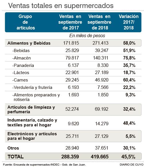Un informe del Instituto Nacional de Estadísticas y Censos (INDEC) reveló que el índice de ventas totales a precios corrientes aumentó en septiembre un 45,5%, comparado con el mismo mes del año pasado, lo que ubicó a San Juan como primera provincia por el incremento de la actividad, incluso por encima de la media nacional, que fue del 30,8%. Entre las causas que propiciaron el incremento se encuentran el crecimiento de la actividad económica, que alcanzó el 6,2%, y la implementación por parte del Gobierno de la cláusula gatillo, siendo San Juan la única provincia que cuenta con esta herramienta que posibilita que los empleados públicos no pierdan la carrera frente a la inflación, según reconocieron fuentes del sector supermercadista.
