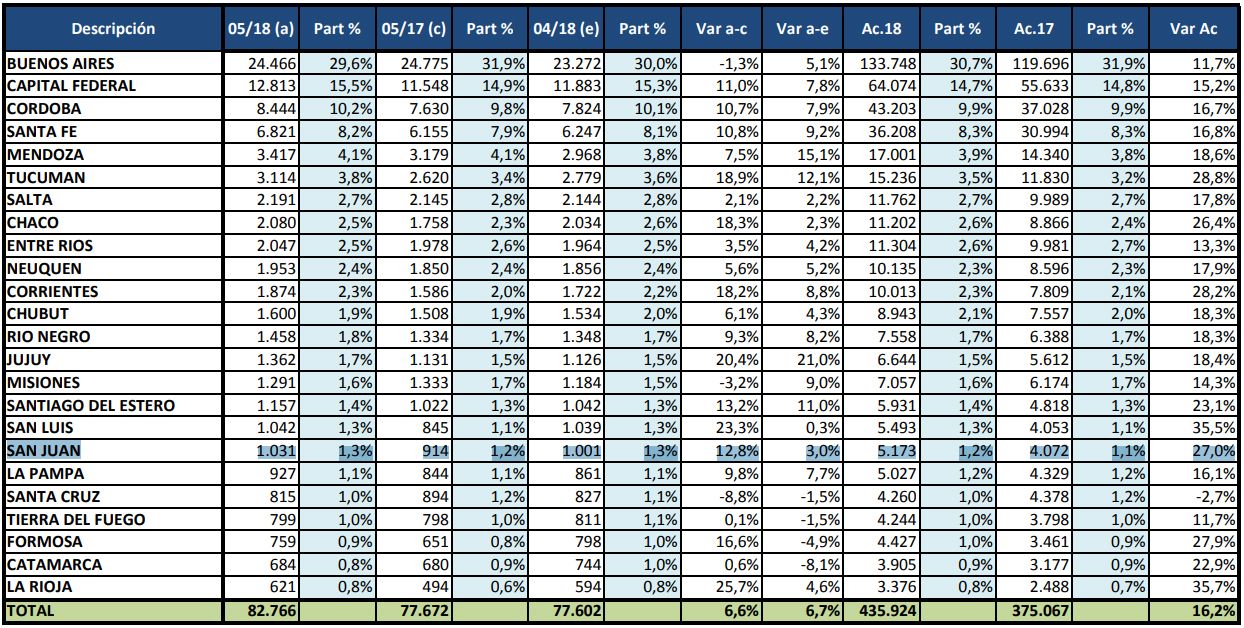 De acuerdo a los datos informado por la Asociación de Concesionarios de Automotores de la República Argentina (ACARA), en San Juan el mes de mayo arrojó un crecimiento del 12,8% comparado con mayo de 2017, pero con respecto a abril de este año el salto fue de apenas el 3%. En la comparación interanual, en el país el alza alcanzó el 6,6%.