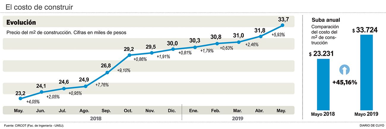 Según el nuevo índice de construcción que acaba de publicar el Circot (Centro para la Racionalización de la Construcción Tradicional), de la Universidad Nacional de San Juan el costo del metro cuadrado trepó en mayo a $33.724 en esta provincia, reflejando un aumento de 5,93% respecto al valor que tenia en abril (ver infografía) debido principalmente a los aumentos salariales de los obreros de la construcción. Hay que remontarse al mes de octubre del 2018 cuando subió un 9,10% respecto al mes anterior, para encontrar un salto tan importante.