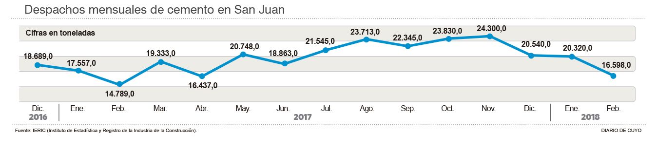 Durante el mes de febrero pasado se consumieron en San Juan 16.598 toneladas de cemento en bolsa y a granel, una cifra que bajó 18% respecto a enero y que evidencia una fuerte desaceleración, al perforar la barrera de las 20 mil toneladas en que se había mantenido el despacho de ese material en la provincia durante los últimos nueve meses. Hay que remontarse al mes de abril de 2017 para encontrar una venta parecida, que entonces fue de 16.437 toneladas (ver infografía), según revelan las cifras publicadas por el Instituto de Estadísticas y registro de la Industria de la Construcción (IERIC). En la comparación interanual, el consumo local de febrero respecto a igual mes del año pasado aumentó un 12%. En la delegación local de la Cámara Argentina de la Construcción dicen que la razón principal de este “enfriamiento” en el uso de cemento es porque el grueso de obra pública ya se hizo y aún no arrancan las nuevas. “”Han ido terminando algunas obras y no se han puesto en marcha las nuevas”, explicó Enrique Velasco, presidente de la entidad. Mencionó que han finalizado varios barrios, la parte sur de la ruta 40 disminuyó el ritmo y ya está casi listo el edificio que compartirán el Registro Civil y la Subsecretaría de Trabajo en calle Mendoza, casi Entre Ríos, por ejemplo. “”Eso ha hecho también que caiga el nivel de ocupación”, expresó el constructor. Lamentablemente las cifras de ocupación del IERIC están rezagadas y sólo están hasta las de enero, donde la cantidad de trabajadores era casi igual que en diciembre, 10.463 puestos de trabajo. Pese a este escenario, Velasco destacó que el sector es optimista y tiene expectativas de que se revierta la situación, aunque admitió que la obra publica nueva “”se ha demorado más de los pensado”, ya que se esperaba un envión en el primer trimestre del 2018 que tarda en activarse. Hasta ahora señaló que sólo se han licitado solamente un par de barrios chicos, como son 48 viviendas en San Martín y 22 viviendas en 9 de julio de las mil viviendas esperadas, y también el velódromo y el servicio penitenciario. De todos modos, tardará unos meses que la activación de esas obras comience a impactar en el consumo de cemento y en la ocupación del sector de la construcción. Además señaló que en el sector privado también se refleja cierto aletargamiento porque no se nota una activación de obras nuevas y en la Cámara de la Construcción dicen que afectan las altas tasas de interés del sistema financiero que frenan la inversión.