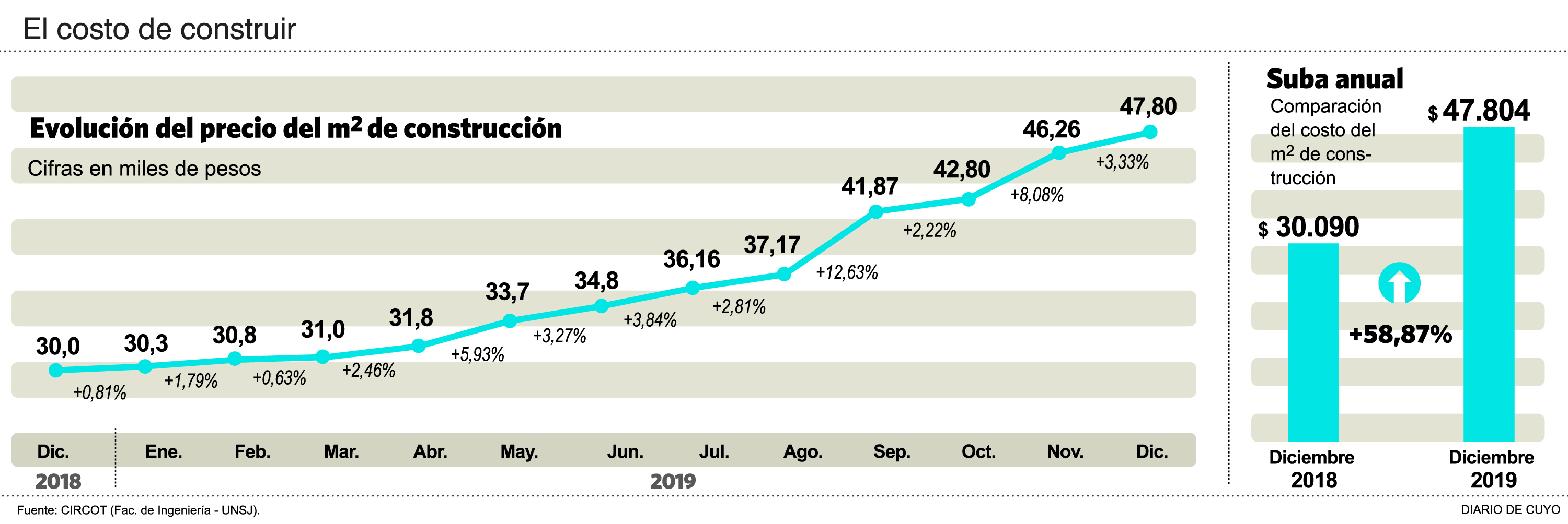 El metro cuadrado ya llegó a $47.800 pesos, luego de un incremento del 3,33% respecto a noviembre, y acumula una suba del 57,59% entre enero y diciembre del 2019, en tanto que si se lo compara con el mismo mes del 2018 la suba interanual es del 58,87%, todos datos oficiales del Centro de Investigación para la Racionalización de la Construcción Tradicional (Circot) que fueron difundidos ayer.