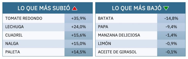 En tanto, los productos que más bajaron en el mismo período fueron la batata (-14,8%), papa (-9,4%), manzana deliciosa (-1,4%), limón (-0,9%) y aceite de girasol (-0,1%).