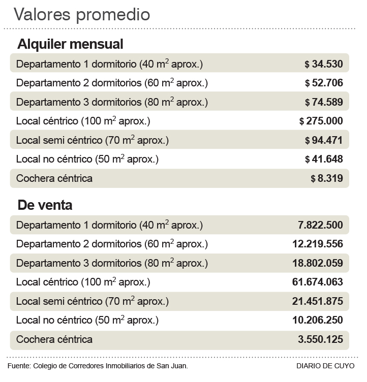Pablo Domínguez, presidente del Colegio de Corredores Inmobiliarios de San Juan, informó que los 270 matriculados que tienen aplicarán una suba del 77%, tanto para actualizaciones (una vez por año), como para renovaciones. En este último caso se actualiza el precio del alquiler, el mes de depósito y los honorarios inmobiliarios también.