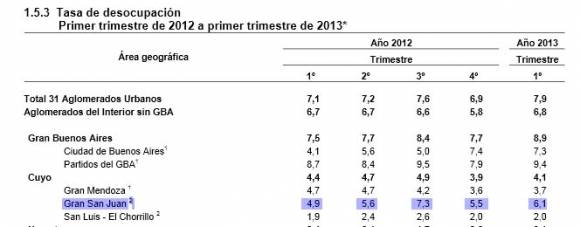 Buenos Aires 20 de mayo.-Buenos Aires 20 de mayo.- En la tarde de hoy el Instituto Nacional de Estadísticas y Censos dio a conocer los resultados del primer trimestre de la encuesta permanente de hogares donde se mide la ocupación de la población económicamente activa. Como resultado el organismo oficial determinó que la desocupación general en argentina pasó del 7,1%, alcanzada en el primer trimestre del 2012, al 7,9% en el mismo periodo pero de este año. San Juan no fue la excepción y la desocupación pasó del 4,9% al 6,1%.