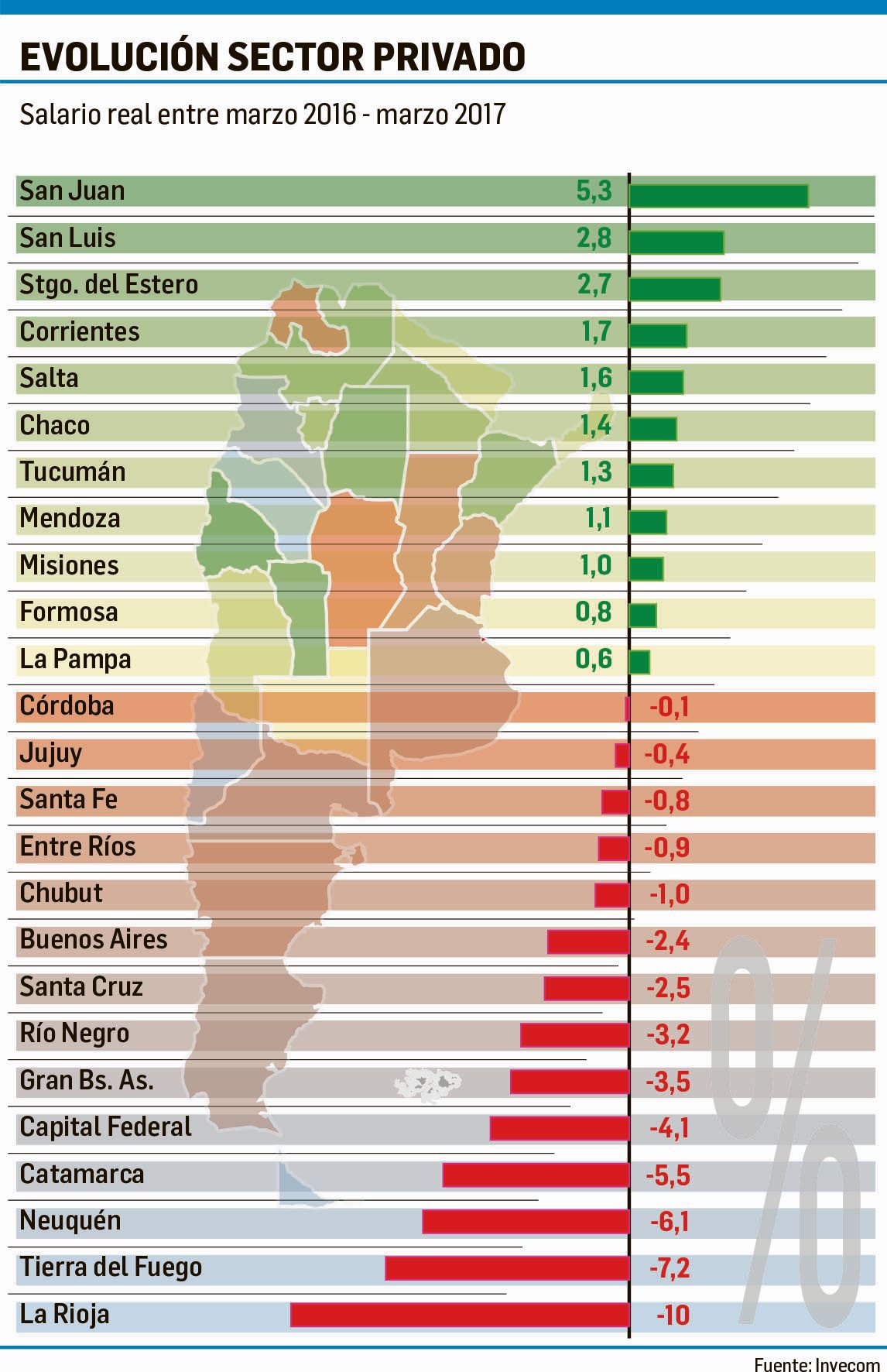 Doce provincias registraron una recuperación del salario real entre marzo de 2016 y marzo de 2017, de acuerdo con un informe realizado por la consultora Invenomica en base a datos del Ministerio de Trabajo y el IPC Congreso.