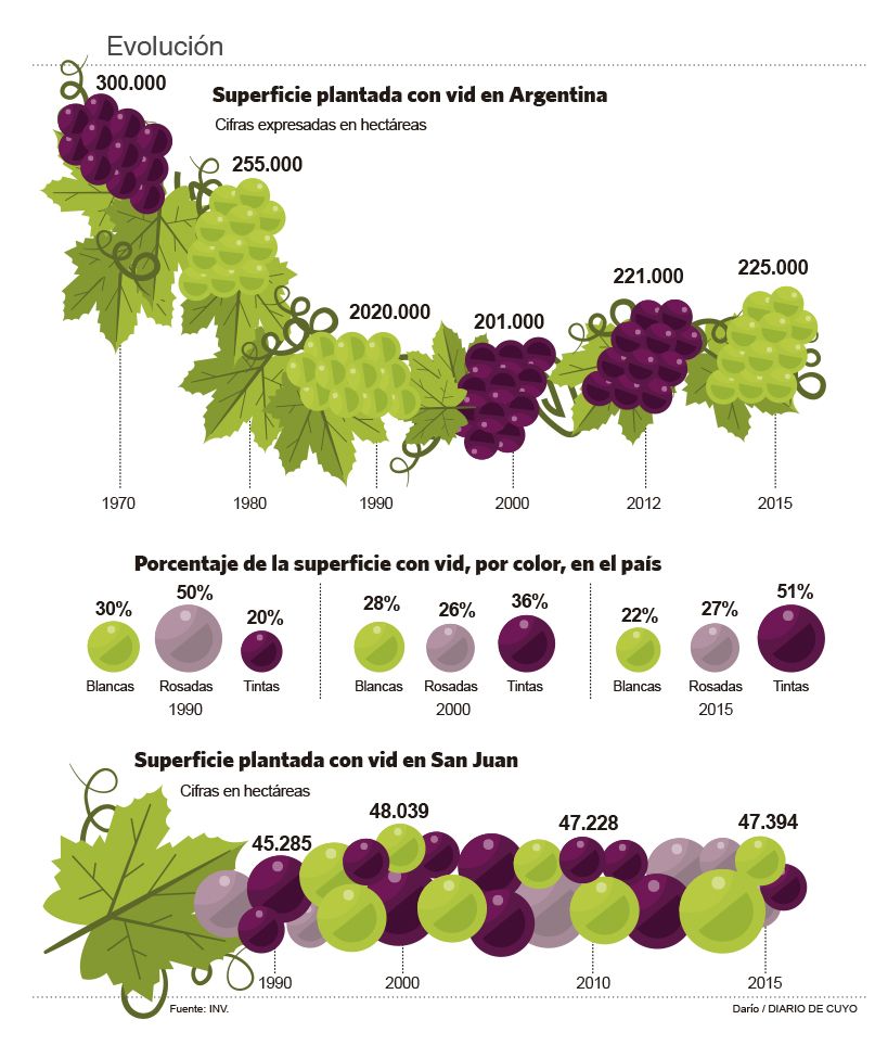 La muestra es representativa de todos los valles viticolas sanjuaninos y equivale al 5% de la superficie real de hectáreas que hay en San Juan que oficialmente asciende a 47.394. Este tamaño de muestra es el que se utiliza para realizar las estadísticas y permite inferir lo que sucede con la totalidad de la superficie. En otras palabras, se puede decir que del total de uvas sanjuaninas, 34.598 productivas y 12.796 improductivas. ""Claro que esto se sabrá con exactitud el año que viene cuando se realice el nacional vitivinícola", advirtió Juan José Ramos, presidente de AVI.