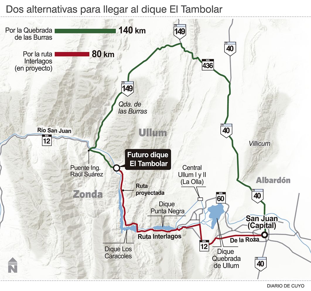 Un paso clave en la construcción del dique El Tambolar tuvo lugar ayer con el desvío de las aguas del río San Juan de la zona donde se hará el futuro paredón de la presa, para que se pueda trabajar en el área, y se la hizo ingresar por el túnel previsto para ese fin. Junto con ese hito y debido a que parte de la actual ruta a Calingasta por la Quebrada de Las Burras quedará bajo el agua, en el Gobierno provincial apuran el proyecto para hacer la vinculación con ese departamento a través de la vieja Ruta 12, por la también llamada Ruta Interlagos, que permitirá acortar la llegada al embalse unos 60 kilómetros, de los 140 kilómetros que son necesarios en la actualidad.