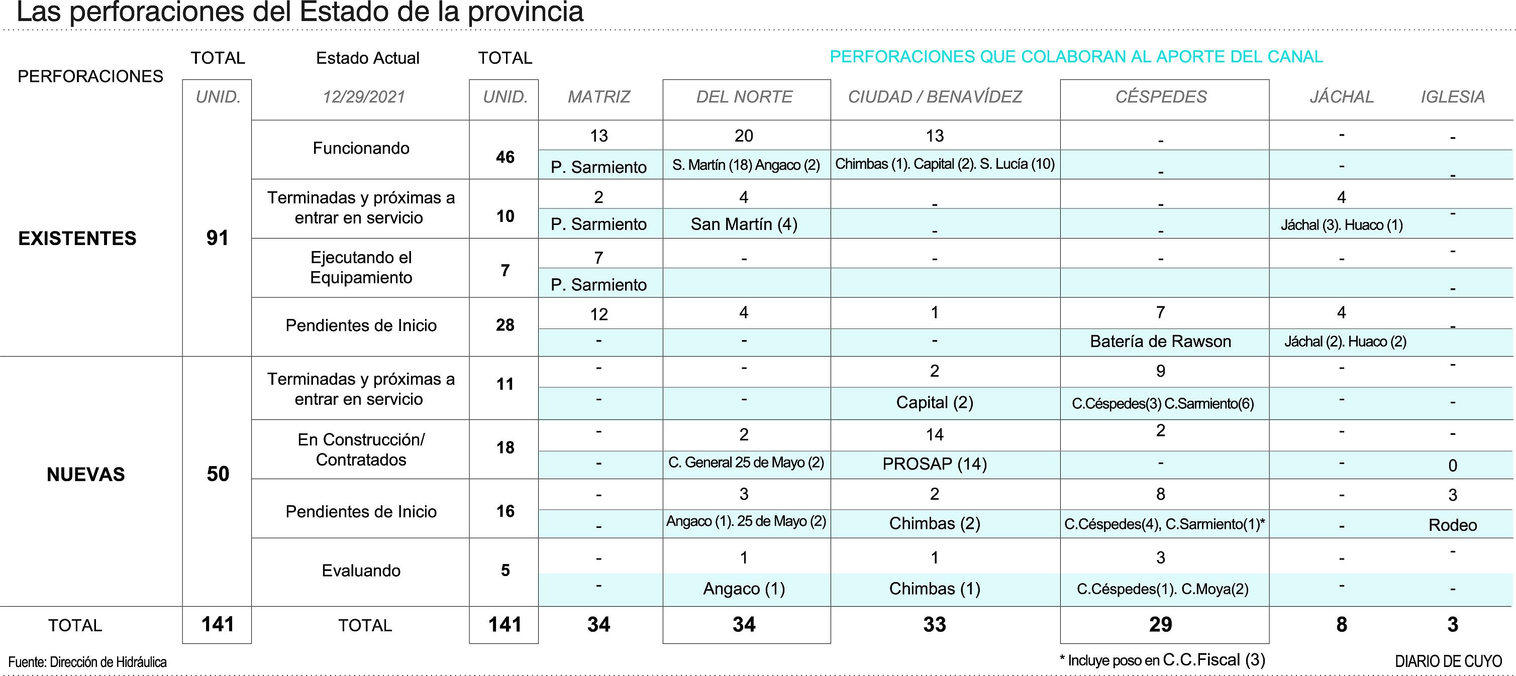 La reparación de la vieja batería de pozos oficial y la construcción de nuevas perforaciones fue una de las principales medidas que se instrumentaron el año que terminó para sumar agua subterránea a la poca que trae el río este año por la crisis hídrica y regar las plantaciones. El director de Hidráulica, Oscar Coria, informó que el 2021 cerró con 46 perforaciones funcionando a la fecha, un salto considerable teniendo en cuenta que hace un año a esta altura había solamente 5 operativas, pero pocos para el sector agroproductivo que esperaba contar con más de un centenar y así haber evitado el incremento de días de corte de agua de los canales. En Hidráulica consideran que no están demorados, sino que están trabajando a toda máquina y superando los obstáculos inesperados que se les presentan con el plan de obras, como por ejemplo, pozos viejos que son imposible de recuperar, o los tramites administrativos que requiere una obra pública y que corre por carriles diferentes a las urgencias diarias. Incluso admiten que todos los arreglos y construcción de pozos los financió el Ministerio de Producción, porque así era más rápido. Coria aseguró que en el mes de enero y febrero se sumarán otras 21 perforaciones al servicio, de las cuales 10 pertenecen a la batería de perforaciones existentes desde hace años, y otras 11 son nuevas (ver infografía). En tanto, de las 46 perforaciones que están funcionando hay 13 ubicadas en el parque Sarmiento que contribuyen al agua superficial que se distribuye por el canal Matriz, otras 20 surten al Canal del Norte y otras 13 aportan a los canales Ciudad y el Benavídez. Todos esos son pozos recuperados de la vieja batería oficial. El Consejo Provincial para Control de Embalses y Seguridad de Presas, liderado por el Ministerio de Obras de quien depende Hidráulica, indicó en agosto pasado que se iban a incorporar 125 pozos como fuentes de agua subterránea que permitieran suplantar parcialmente el agua superficial en la red de distribución y reservarla en los diques. Es que Caracoles, Punta Negra y Ullum deben conservar un mínimo de agua para no romperse. En aquel momento se informó que a las 32 perforaciones en uso, se agregarían 43 más que están en proceso de reparación, equipamiento o energización. Además se iban a construir otros 50 pozos nuevos en lugares elegidos por su cercanía a canales de riego, sin interferir con pozos privados y en acuíferos de buen rendimiento que permitan extraer de 80 a 100 litros por segundo.