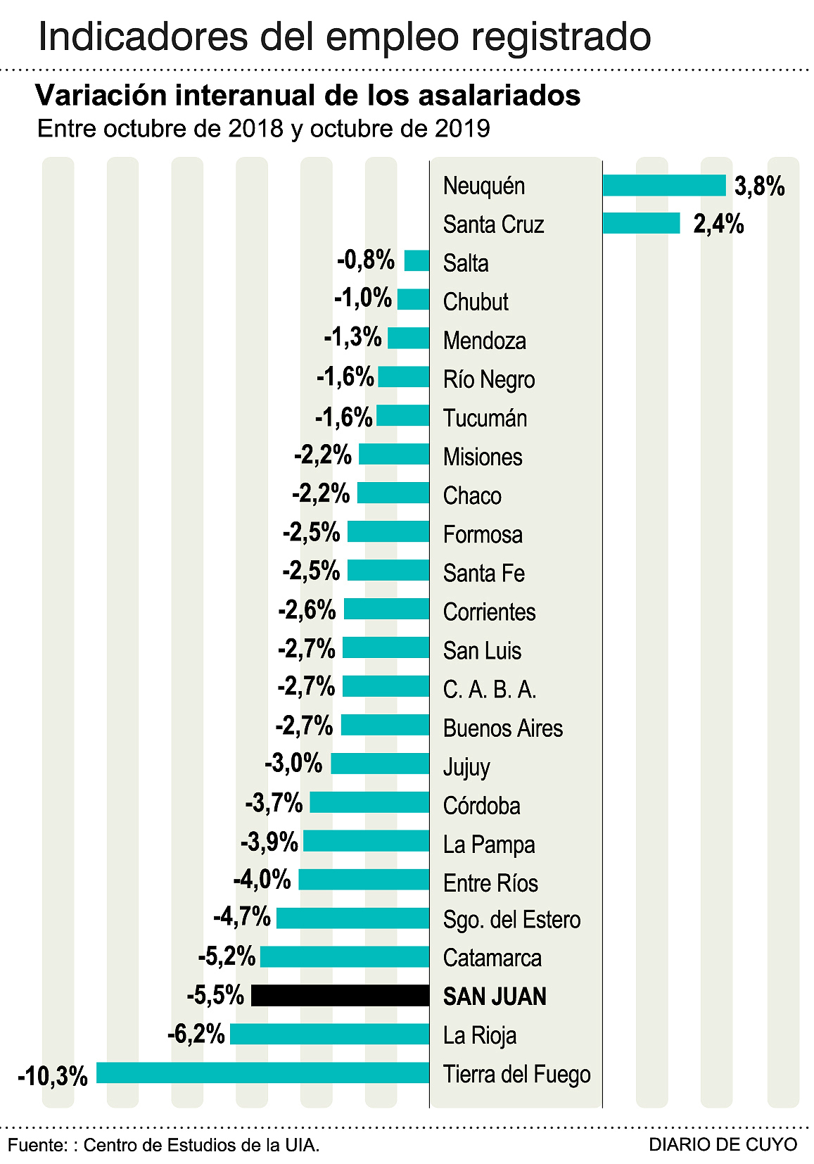 La provincia de San Juan no fue ajena a la crisis que afectó el mercado laboral en todo el país durante el 2019 y lamentablemente ocupó uno de los lugares más afectados por la caída de puestos de trabajo registrados del sector privado. Según un informe de Indicadores laborales que acaba de difundir la Unión Industrial Argentina, San Juan sufrió una caída del 5,5% en la cantidad de empleos en blanco, en octubre de 2019, respecto a octubre de 2018, situación que fue admitida ayer por sectores del comercio, la industria y el gobierno. Sin embargo, en esos ámbitos creen que la situación se revertirá en el 2020, a partir de las medidas que está tomando la Nación. ""Argentina ha iniciado un período de recuperación a través de medidas como la Ley de Emergencia (ver opiniones en página 3) y tenemos expectativas de que en 2020 las medidas que tomó el presidente de la Nación surtan efecto y estos números se reviertan", dijo la ministra de Hacienda, Marisa López. En el sector privado también son optimistas. El estudio destaca que las únicas que no cayeron fueron Neuquén, que tuvo un incremento interanual de 3,8% impulsado por el aumento de la actividad vinculada a Vaca Muerta, y Santa Cruz, que mejoró 2,4% por explotaciones petroleras y mineras. El resto de jurisdicciones tuvo caídas generalizadas y entre las más afectadas están Tierra del Fuego (-10,3% interanual), La Rioja (-6,2%) y San Juan (-5,5%). ""No somos ajenos a la problemática del país, en general todas las provincias han tenido un incremento en el desempleo privado e industrial, salvo Neuquén por Vaca Muerta", explicó López. Añadió que el descenso de empleo registrado no significa que la gente esté desempleada, ya que hay subempleo, o empleo no registrado; una informalidad ""causada por los altos costos de registración". También destacó que la política local de articular lo público con lo privado permitió que aquí la tasa de desempleo fuese menor a la media nacional