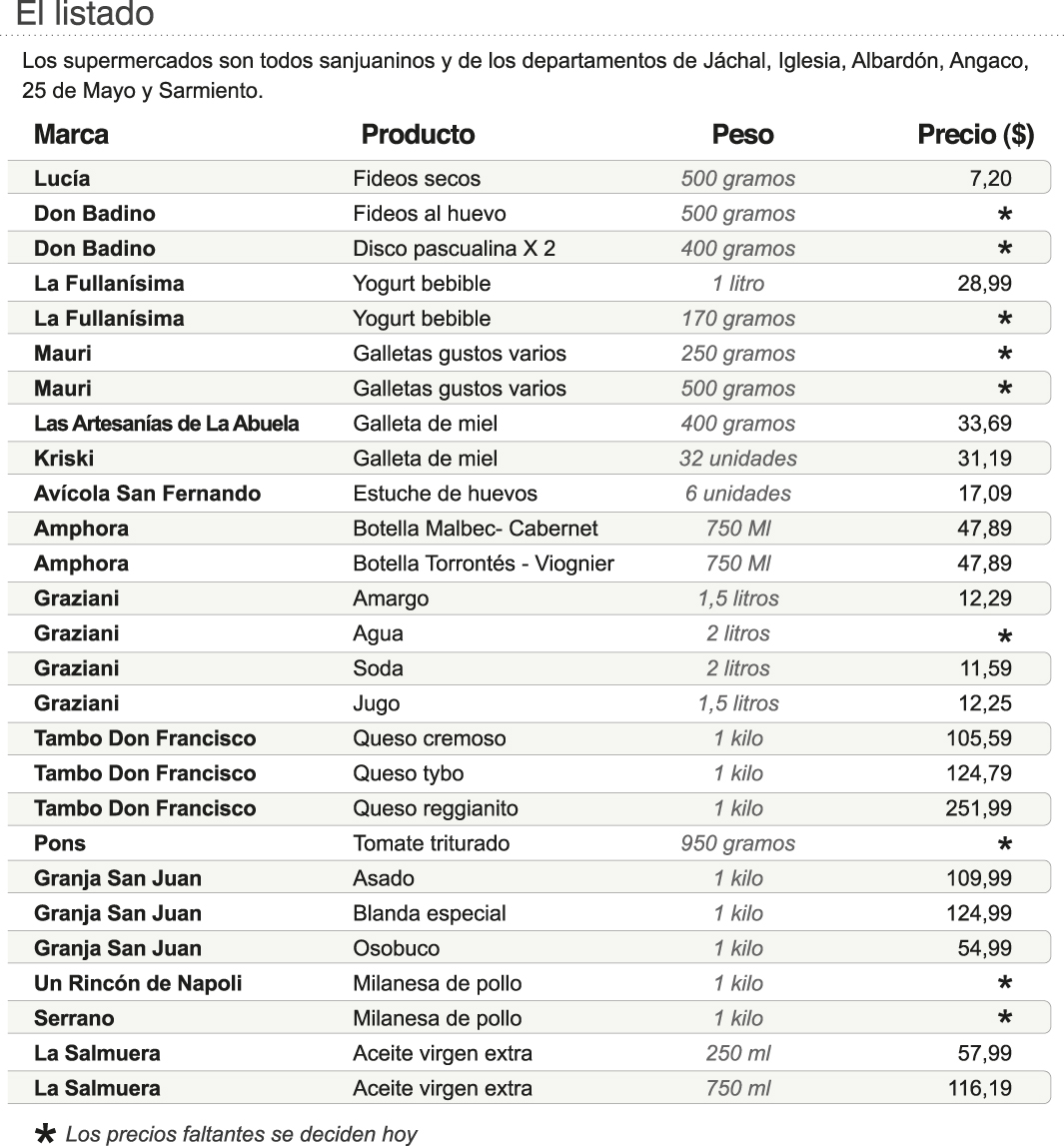 En la oferta de productos hay lácteos, aguas, sodas, jugos, aceites, vinos, carnes, fideos y pollos, entre otros; todos elaborados por pymes locales. Son 27 productos (ver infografía), de los cuales la mayoría seguirá con el mismo precio, principalmente las carnes y pollos, algo raro en momentos donde la inflación ha provocado una ola de remarcaciones en el comienzo del 2018. Hay 9 que podrían tener un pequeño ajuste, lo cual se decidirá hoy, pero anticipan que será mínimo. Además, no se descarta que se sumen algunos productos más, como fiambres o servilletas de papel o rollos de cocina.