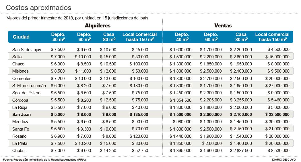 Lo que hasta ahora era una preocupación de los comerciantes que alquilan un local en el microcentro de la Capital fue confirmado por un relevamiento de una entidad nacional. En su informe del primer trimestre del 2018, la Federación Inmobiliaria de la República Argentina (FIRA) dio a conocer que alquilar un salón de hasta 150 m2 en San Juan cuesta 135.000 pesos mensuales, que es el segundo valor más alto del país después de San Miguel de Tucumán, donde el monto asciende a 180.000 pesos. Por primer vez la institución, que ya venía midiendo valores de alquileres y de compra-venta de casas y departamentos de 15 ciudades, sumó el rubro de espacios para negocios.