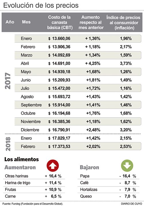 Respecto al comportamiento de precios de los alimentos en San Juan, las mayores subas se registraron en aquellos alimentos que tienen gran peso en el conjunto de la canasta alimentaria. Las harinas y frutas, pero fundamentalmente los incrementos de precios de las carnes (ver infografía). Este último alimento en forma unitaria explica el 37,6% del total de la Canasta Básica Alimentaria que es la que determina los productos mínimos que debe consumir una familia de dos adultos y dos menores para subsistir. En febrero esa canasta se elevó a $ 7.634 y quienes tienen ingresos menores a esa cifra entran en la línea de Indigencia.