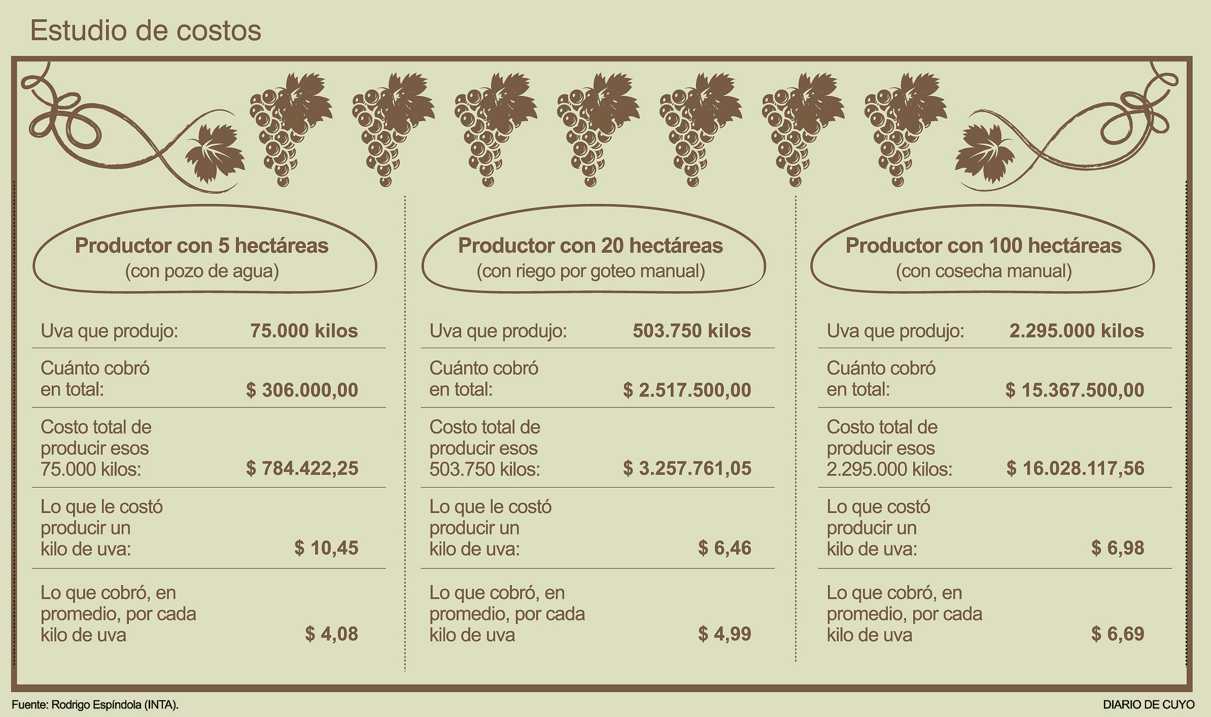 El resultado revela que el productor más chico -que es la mayoría en esta provincia- es el que está en peor situación (ver infografía). De acuerdo a los últimos datos del INV, el 76,6% de los productores tiene 10 hectáreas o menos y el análisis privado revela que justamente por la gran diferencia entre el costo de producir y lo que gana con la venta de la uva está descapitalizado, su estructura es antigua al igual que sus plantas por lo que las producciones son bajas, no tiene posibilidades de invertir ni hacer mejoras y es susceptible al ataque de plagas y enfermedades por realizar controles deficientes. ""Este estudio concluye en que este grupo de productores, si sigue así, va a desaparecer o será absorbido por el grupo más eficiente que es el de 20 o el de 100 hectáreas", explicó Espíndola.