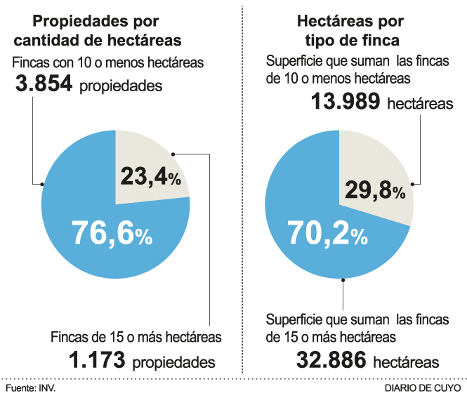 Es que según el último relevamiento del Instituto, el 70,2% de los viñedos está en manos de pocos productores (1.173 de un total de 5.027 en San Juan) que tienen fincas de mayor porte, con más hectáreas.