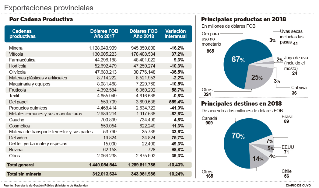 El año pasado las exportaciones de San Juan dejaron un sabor agridulce. Las ventas de metales preciosos y piedras que representan el mayor peso en el conjunto no brillaron tanto y registraron una baja, a consecuencia de la menor producción de las minas que ya han entrado en un ciclo descendente. Pero el panorama cambia con la buena performance que tuvieron las restantes cadenas productivas tales como la vitícola, frutícola y farmacéutica, entre otras (ver infografía). Las exportaciones provinciales totalizaron casi los 1.290 millones de dólares durante el 2018, lo que mostró una baja de 10,4% respecto al año anterior; según informó la Secretaría de Gestión Pública del Ministerio de Hacienda, en base a datos del Indec.