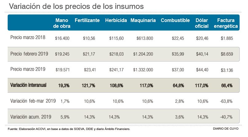 Los informes de costos en la vitivinicultura siempre son polémicos y más cuando la rentabilidad está al límite como en la actualidad. Y en este caso el estudio que hizo la Asociación de Cooperativas Vitivinícolas Argentinas (Acovi) entidad que reúne a bodegas mendocinas, sobre la pérdida del poder adquisitivo del vino, no es la excepción ya que ha despertado el enojo en viñateros de San Juan. Las dos entidades grandes de productores locales dicen que el informe fue hecho con ""intencionalidad" de perjudicar a los viñateros que entregaron sus uvas por el sistema a maquila a las bodegas, y que por tal motivo los números están "exagerados". La elaboración a maquila implica que el viñatero entrega la uva al industrial obteniendo un porcentaje del vino de idéntica calidad al que se queda la bodega. El informe denominado "Poder adquisitivo del vino" compara el precio del vino que recibe el productor vitivinícola con el precio de los insumos que utiliza para producir, y otros bienes, entre marzo de este año con igual mes del 2018. Según eso, señala que el poder adquisitivo ha sufrido un fuerte deterioro en el ultimo año: en el caso del vino tinto genérico se requiere entre 60% y 190% más de vino que el mismo mes de 2018 para poder pagar los costos de hacerlo. En cuanto al vino blanco este incremento va de 30% a 144%. Agrega que esto es por dos causas: los costos del productor siguen en alza y además el precio del vino sigue a la baja mientras que los precios de los insumos y otros bienes han aumentado. Los números se pueden ver en la infografía que acompaña esta nota. Se midieron tres costos directos que tiene un productor de vino -fertilizantes, energía eléctrica y combustible- y también se añadió una comparación con la canasta básica de alimentos.