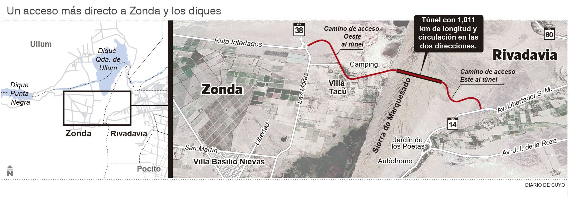 Es un camino expedito entre la Ruta Provincial 14 y la Ruta Provincial 38. Consta de un túnel de 1 kilómetro de longitud; y dos caminos de acceso pavimentados que totalizan 4,7 kilómetros: uno para conectar la Ruta 14 con el túnel en Rivadavia, y otro para conectar el túnel con la Ruta 38 en Zonda. Desde la Ciudad de San Juan se puede llegar a través de la avenida Libertador San Martín, o la Ignacio de la Roza. A la altura del Jardín de los Poetas nacerá un camino hacia el norte que conducirá al portal este del túnel. En las inmediaciones de la Villa Tacú y del Camping de Zonda estará el camino hacia el portal oeste del túnel.