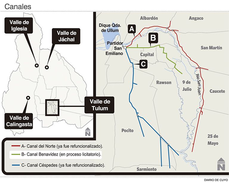 Con la finalidad de dejar de desperdiciar el agua de regadío, por filtraciones en un sistema de conducción viejo y roto; el mes próximo el Ministerio de Producción dará un paso importante al licitar una obra de mejora de canales que va a beneficiar a 1.019 productores distribuidos en los departamentos Chimbas, Santa Lucía y 9 de Julio. Se trata de la red secundaria del sistema de riego del canal Benavídez que permitirá la mejora de un total de 47,5 kilómetros de canales. Al igual que el canal principal, el sistema secundario de regadío data del año 1950 y ya muestra los daños del paso del tiempo a lo largo de su recorrido.