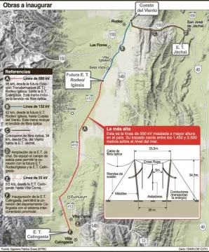 ‘’Cualquiera podría decir que estamos haciendo una línea eléctrica totalmente sobredimensionada, pero nuestra visión es de aquí a 20 años. Cuando toda la zona Oeste del país este conectada, San Juan tendrá en línea 3.500 Megavatios (hoy consume la provincia 430 Megavatios), suficientes para encarar cualquier gran proyecto productivo’’, dijo ayer el presidente del EPRE, Jorge Rivera Prudencio. Los dichos del funcionario responden a que inicialmente la línea de 500 kV funcionará a una capacidad bastante menor, de tan sólo 132 kV. ‘’Se trató de una obra muy compleja en su ejecución, porque debíamos prever absolutamente todo: impacto ambiental, visual y condiciones climáticas de la zona.