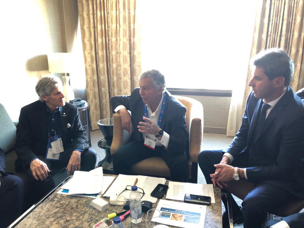 En el primero de los encuentros, el gobernador Uñac y el ministro de Minería de la Provincia, Alberto Hensel, acompañados por secretario de Minería de la Nación, Daniel Meilán, se reunieron con Rob McEwen, director de la empresa McEwen Mining, compañía que a través de su subsidiaria Andes Corporación Minera está desarrollando en San Juan el proyecto Los Azules, ubicado al norte de Pachón, a unos 150 kilómetros de Villa Calingasta.
