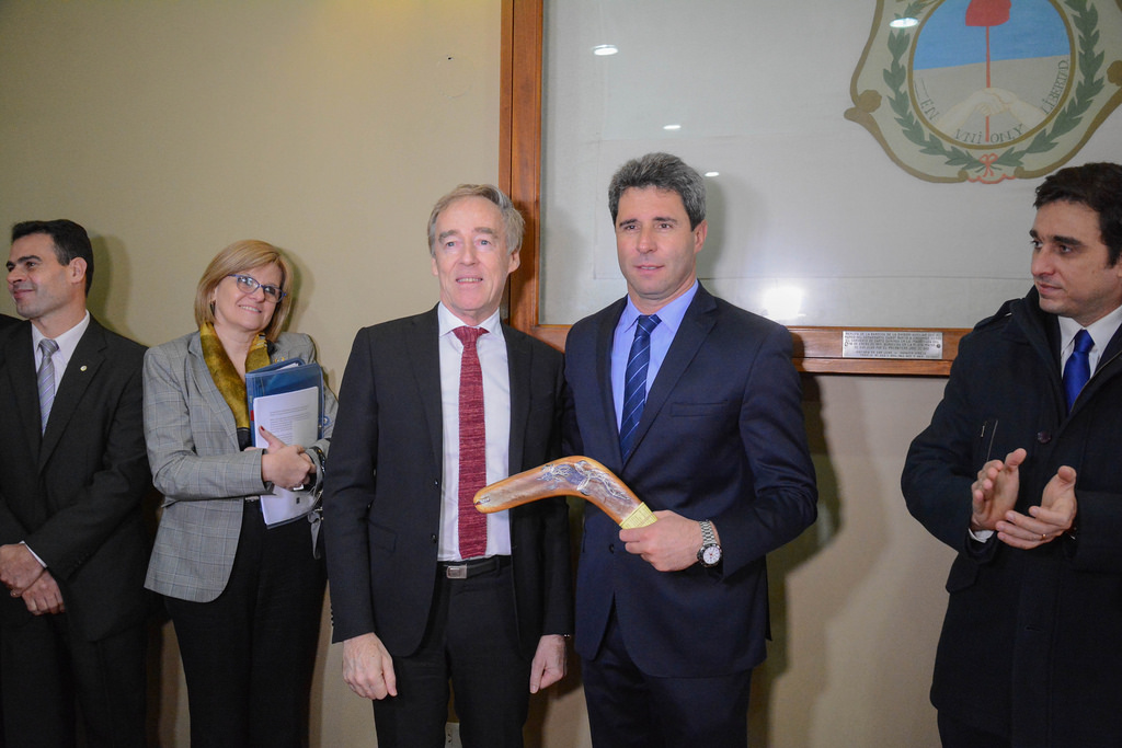 Por su parte, Campbell "es una relación que tiene mucho potencial". Luego, llegó el momento del intercambio de presentes y allí el asutraliano le entregó a Uñac un boomerang "como este elemento, que va y viene, espero que usted vaya a Australiua en un futuro".