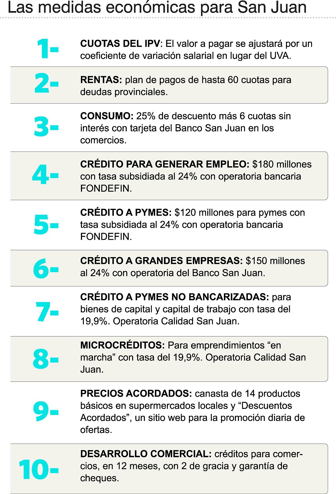 En cuanto al incentivo al consumo hay dos medidas. Por un lado, se acordó con el Banco San Juan reeditar por 120 días la línea para sus tarjetas de crédito, que otorga descuentos de entre el 15% y el 25% en comercios adheridos y seis cuotas sin interés para la compra con los plásticos. El interés es cero por estar subsidiado por el Gobierno. Por otro, con los supermercados locales se logró un acuerdo de precios que se lanzará la semana próxima sobre unos 14 productos de la canasta básica, tal como se hace desde hace dos años. Simultáneamente debuta "Descuentos Acordados", un sitio web donde los comercios adheridos diariamente publicarán importantes descuentos