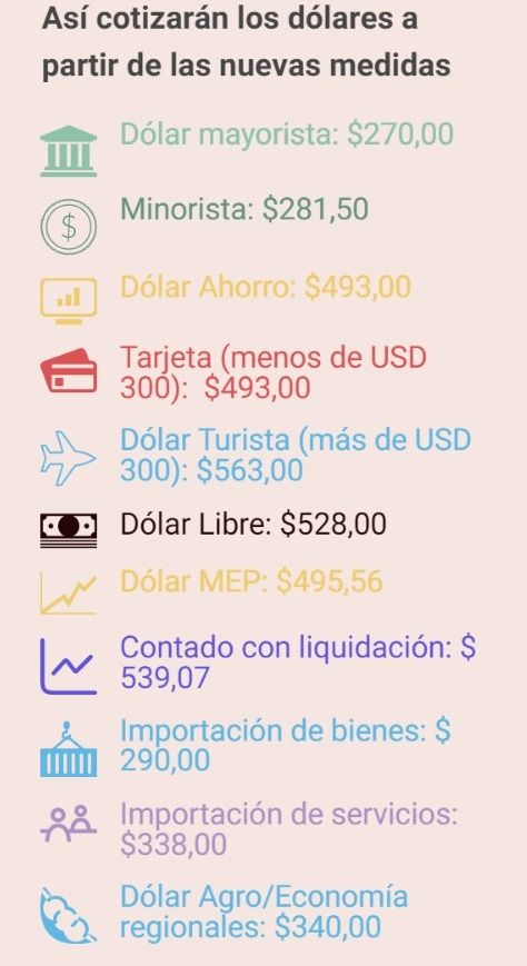 De esta manera, el dólar mayorista ($270) seguirá determinándose en las operaciones diarias del llamado Mercado Único y Libre de Cambios (MULC) mientras que el dólar minorista seguirá siendo una referencia publicada por las pizarras de los bancos ($281,50, según la pizarra del Banco Nación).