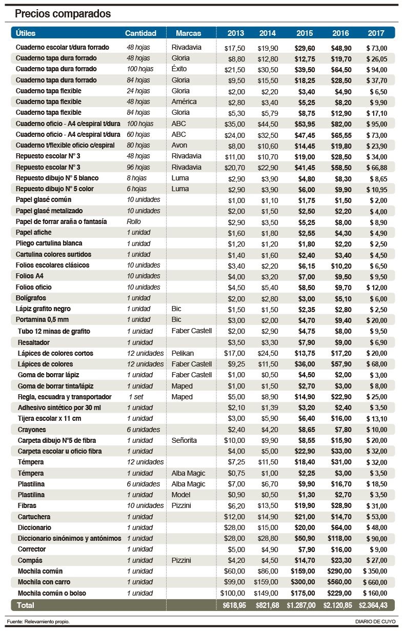 Es que, con la lista en mano que entregaron en las escuelas a fines del año pasado, los papás ya saben qué deben comprar. Y, para sorpresa de propios y extraños, el aumento interanual alcanzó sólo el 11,4%, según un relevamiento de DIARIO DE CUYO sobre 51 artículos escolares.