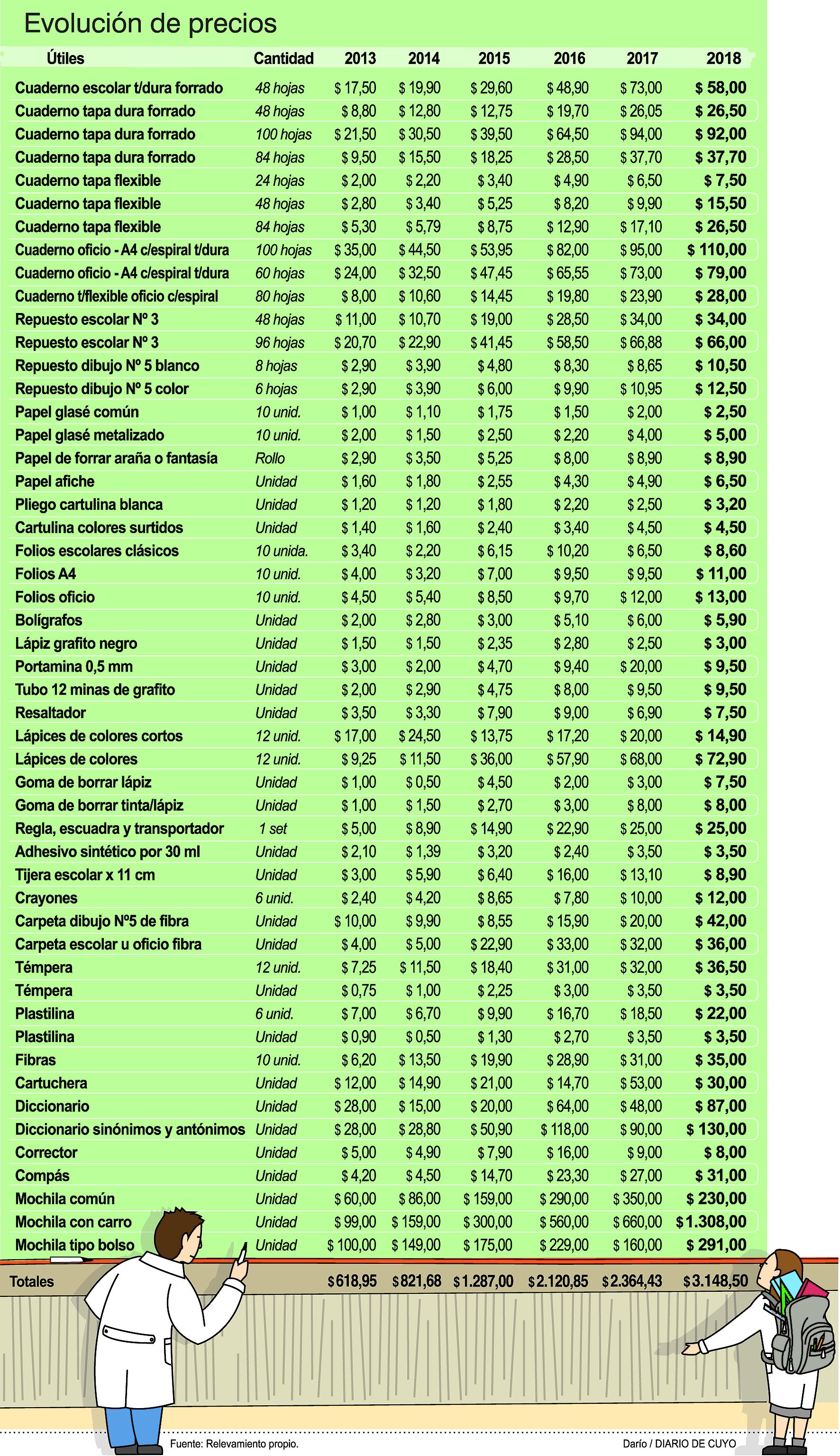 De acuerdo al relevamiento que DIARIO DE CUYO hace cada año en esta época, sobre los precios de los mismos 51 artículos se encontró que el total de esa canasta escolar está 33% más cara que el año pasado. Si los papás tuvieran que comprar esa canasta completa deberán contar en el 2018 con 3,148,50 pesos, frente a los 2.364,43 pesos que eran necesarios el año pasado (ver infografía).
