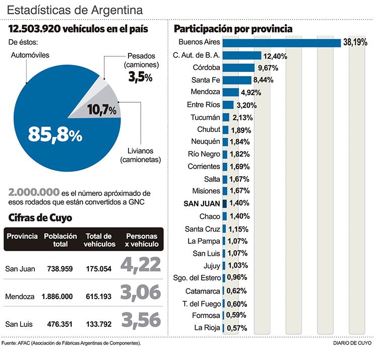 Según los datos estadísticos de la AFAC (Asociación de Fábricas Argentinas de Componentes) a junio del año pasado en toda la provincia había una flota vehicular circulante de 175.054 vehículos, entre automóviles, camionetas y utilitarios, y camiones. Si tenemos en cuenta el censo poblacional del 2010, la provincia cuenta con 738.959 habitantes, lo que da como resultado que en San Juan hay un automóvil cada cuatro habitantes. Sin embargo, pese a que parece mucho, en realidad esta provincia es la de menor densidad del parque automotor de Cuyo. Mendoza lidera con un vehículo cada 3 habitantes, y San Luis con uno por cada 3,5 pobladores. En un informe realizado en 2017 por DIARIO de CUYO especialistas y funcionarios relacionados al tema dijeron que esto es culpa de la gran concentración urbana en una parte pequeña de la provincia. La mayoría de la población y los servicios se concentra en 7 departamentos: los del Gran San Juan -Capital, Santa Lucía, Rawson, Rivadavia y Chimbas- más Pocito y Albardón. Obviamente, allí es por donde circulan también la mayoría de los vehículos, lo que colabora con la realidad del conflictivo tránsito en esta provincia. En cambio en provincias como San Luis, que tienen menos habitantes, cuenta con ciudades más dispersas y con todos los servicios como La Punta o Villa Mercedes.