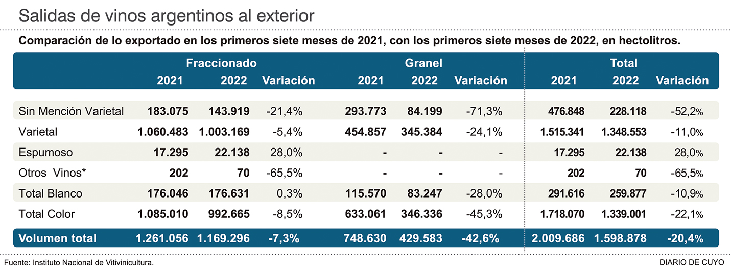 Argentina exportó en los siete primeros meses del año 159,9 millones de litros de vino, reflejando una caída general de 20,4%, según cifras oficiales del Instituto Nacional de Vitivinicultura. Este escenario quiere decir que en lo que va del año se exportaron 41,1 millones de litros menos con respecto al mismo período del año 2021. Los vinos a granel muestran la peor caída en el lapso analizado con una merma de casi el 28% respecto al año anterior, con ventas por 42,9 millones. Los fraccionados exhibieron exportaciones por 116,9 millones de litros, lo que significó una baja del 7,3% interanual. El precio promedio del vino total en el acumulado enero-julio es de 3,02 dólares por litro, llegando el fraccionado a 3,82 dólares por litro y el granel a 0,83 dólares por litro. En cuanto a las exportaciones de mosto concentrado, el INV informó que en lo que va del año ascienden a 46.555 toneladas, un 16,9% menos en volumen y un 8,9% más de ingreso de divisas respecto al mismo período del año anterior. El precio promedio del mosto concentrado en el acumulado del año llega a 1.471 dólares por tonelada.