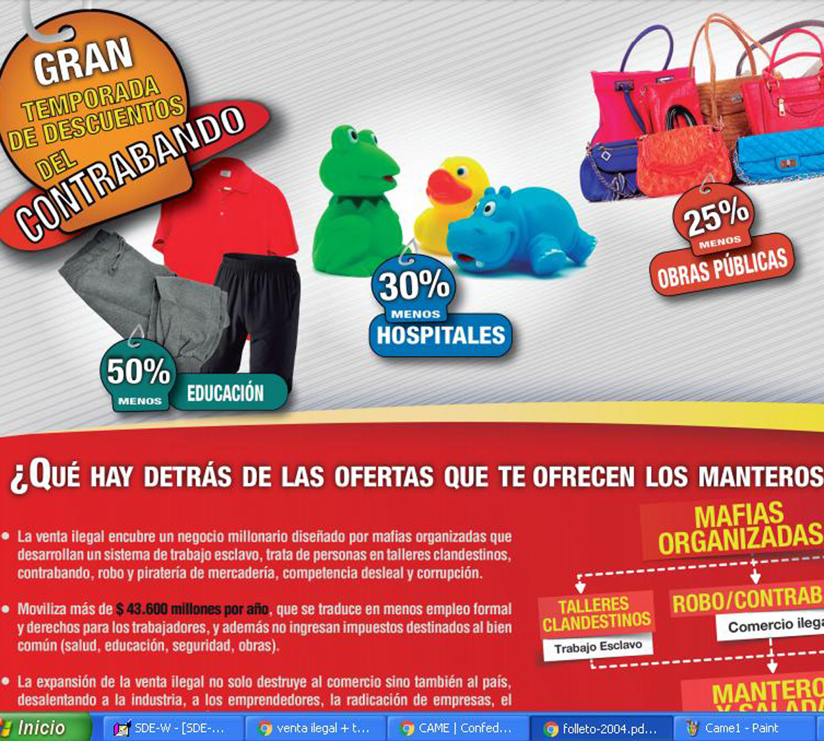 El problema del negocio de la venta ilegal es que en la práctica, según CAME, esconde un negocio millonario diseñado por mafias organizadas que desarrollan un sistema de trabajo esclavo, con trata de personas en talleres clandestinos, contrabando, robo y piratería de mercadería. La competencia desleal se traduce en menos empleo formal y derechos de los trabajadores y además no ingresan impuestos que se podrían destinar a sostener el sistema de salud, educación, seguridad y obras.