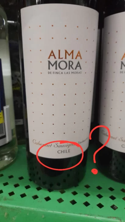 En las redes circula la imagen de un vino de la línea Alma Mora que en la etiqueta frontal tiene la palabra “Chile”, mientras que en la posterior aclara “procedencia Chile”.