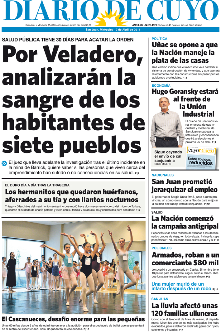 Diario de Cuyo | HOME | Edición impresa Tapa 19 de Abril de 2017 Por Redacción Diario de Cuyo 19/04/2017 · 0:00 Ver los comentarios ›