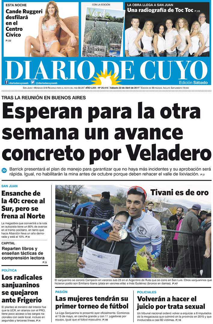 Diario de Cuyo | HOME | Edición impresa Tapa 22 de Abril de 2017 Por Redacción Diario de Cuyo 22/04/2017 · 0:00 Ver los comentarios ›