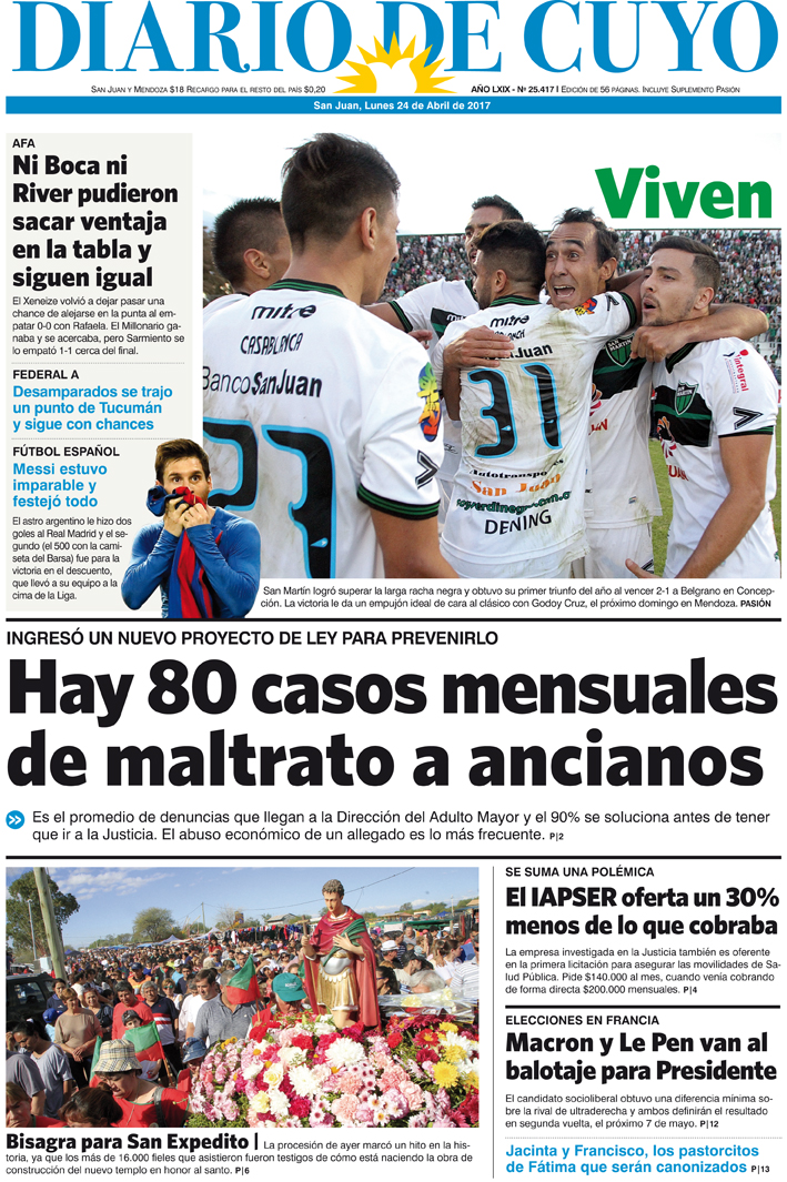 Diario de Cuyo | HOME | Edición impresa Tapa 24 de Abril de 2017 Por Redacción Diario de Cuyo 24/04/2017 · 0:00 Ver los comentarios ›