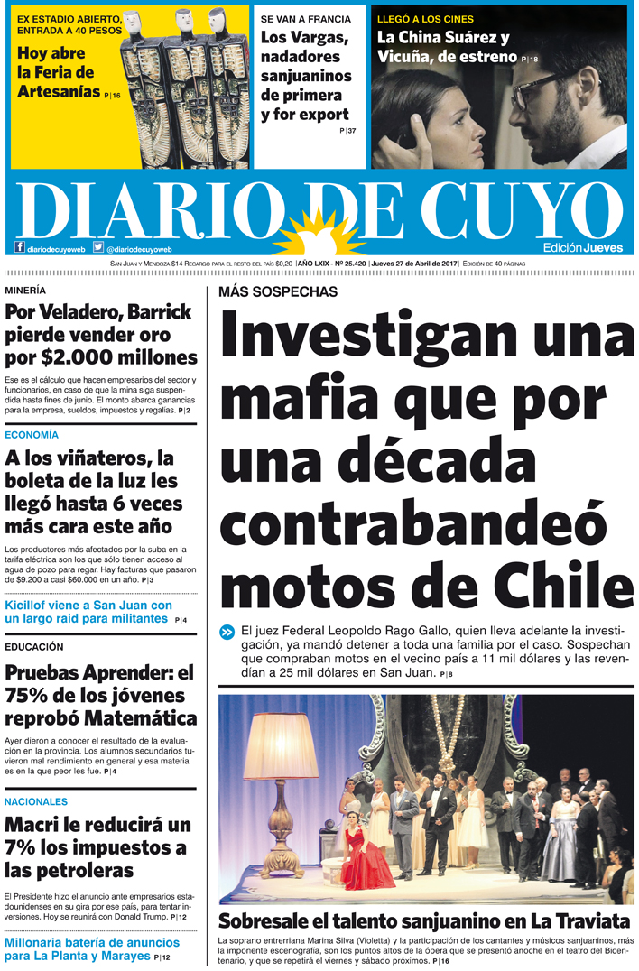 Diario de Cuyo | HOME | Edición impresa Tapa 27 de Abril de 2017 Por Redacción Diario de Cuyo 27/04/2017 · 0:00 Ver los comentarios ›