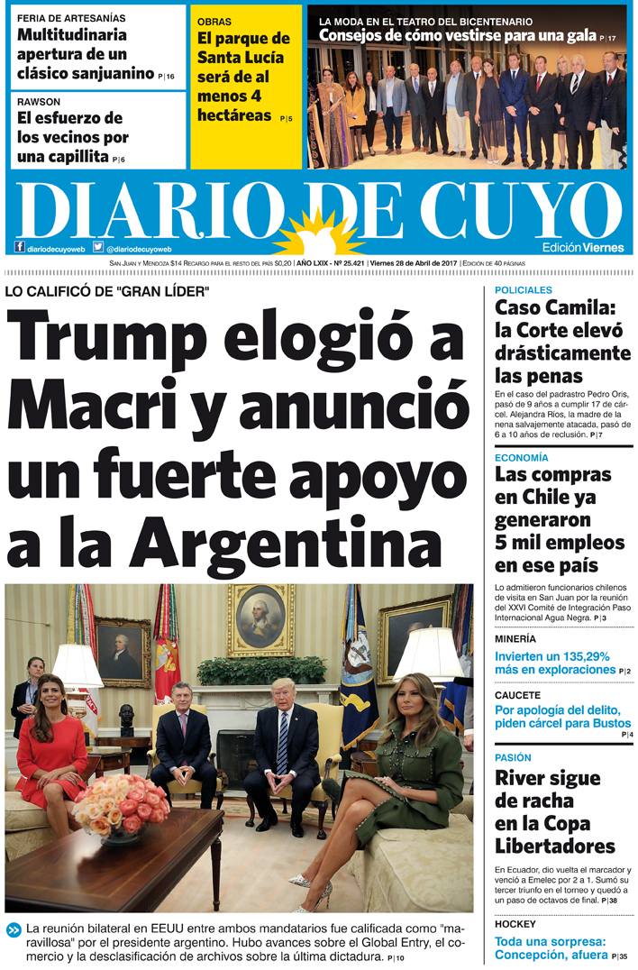 Diario de Cuyo | HOME | Edición impresa Tapa 28 de Abril de 2017 Por Redacción Diario de Cuyo 28/04/2017 · 0:00 Ver los comentarios ›